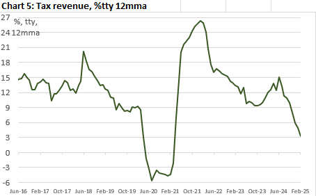 Tax revenue, usually a strong correlate of economic activities, provides a bleaker picture. Tax revenue growth has been slowing sharply since last monsoon (Chart 5), partly due to weakness in economic activities but also reflecting cuts in import duties to reduce cost of living.