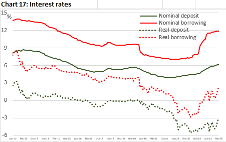 The effects of the new monetary policy framework is visible in the interest rates (Chart 17), with real borrowing rates remaining nearing its historical norms by the summer.