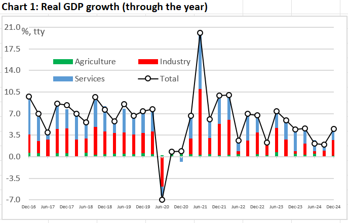 Real GDP grew by 4.9 percent through the year to the March quarter -- continuing a modest pick up after general slowdown since 2022-23 (Chart 1). The disruptions to economic activity in the September quarter are behind us, but the economy is still around 3 percent or so smaller than would have been the case had the pre-pandemic growth rates continued.