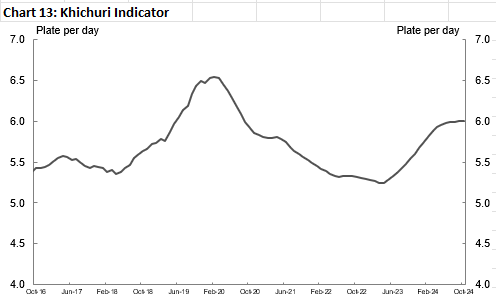 The Khichuri Indicator is a simple measure of the living standard of the urban worker. It shows the number of plates of khichuri -- rice, lentil, oil and salt -- one can buy on the daily wage of a skilled industrial worker. According to the indicator, living standards of the urban worker had barely changed in 2024, and remained well below the pre-pandemic levels (Chart 13).
