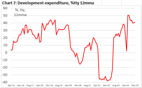 Turning to the other side of the public finance ledger, both non-development and development expenditures grew strongly in the first three quarters of 2024-25 fiscal year (Charts 6 and 7). That is, public demand has likely been contributing to economic growth, notwithstanding the political instability.